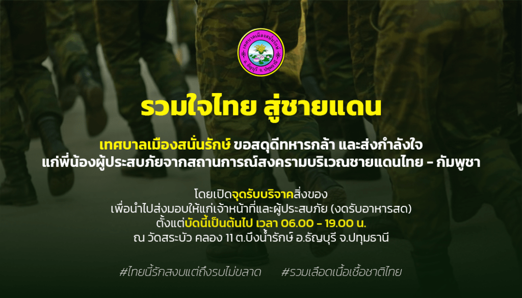 เทศบาลเมืองสนั่นรักษ์ ขอเชิญชวนพ่อแม่ พี่น้อง ชาวไทย บุคลากรในสังกัด หน่วยงานราชการ ภาคเอกชน และประชาชนทั่วไป ร่วมบริจาคสิ่งของที่จำเป็น ได้แก่ ข้าวสาร อาหารแห้ง บะหมี่กึ่งสำเร็จรูป น้ำดื่ม เครื่องใช้จำเป็น เช่น เสื้อผ้า ผ้าห่ม สบู่ ยาสระผม ยาสีฟัน แปรงสีฟัน ยารักษาโรคเบื้องต้น และสิ่งของอุปโภค – บริโภคอื่น ๆ เพื่อช่วยเหลือเยียวยาผู้ได้รับผลกระทบจากสถานการณ์สงครามบริเวณชายแดนไทย – กัมพูชา ที่ส่งผลกระทบต่อผู้ปฏิบัติหน้าที่ ตชด. และทหารกล้าทุกนาย พี่น้องประชาชนในพื้นที่ ทำให้หลายครอบครัวต้องอพยพไป อยู่ในศูนย์อพยพ และขาดแคลนสิ่งของจำเป็นในการดำรงชีพ สิ่งของที่ได้รับจะนำส่งไปช่วยเหลือพี่น้องประชาชน ณ ศูนย์อพยพ โดยเทศบาลเมืองสนั่นรักษ์จะเป็นผู้รวบรวมสิ่งของบริจาค เพื่อนำไปช่วยเหลือผู้ประสบภัยต่อไป
