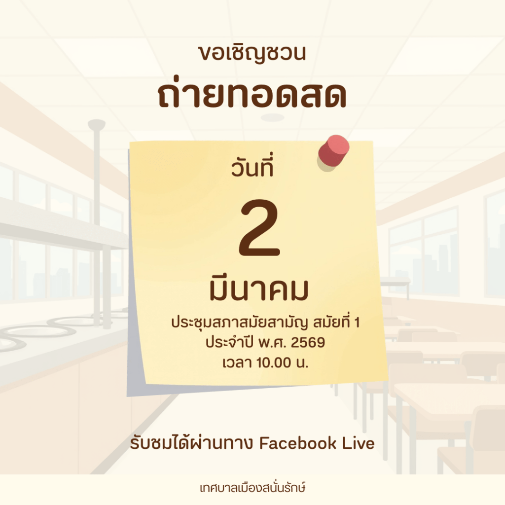 📌 เชิญร่วมติดตาม ถ่ายทอดสดการประชุมสภาเทศบาลเมืองสนั่นรักษ์