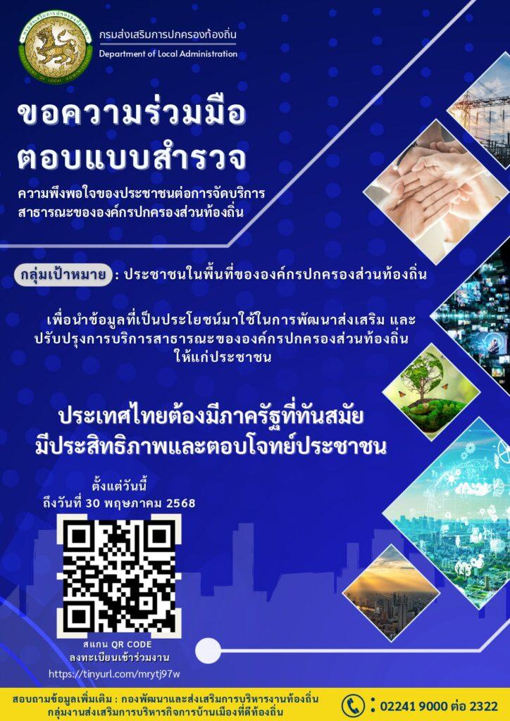 กรมส่งเสริมการปกครองท้องถิ่น ขอความร่วมมือตอบแบบสำรวจความพึงพอใจของประชาชนต่อการจัดการบริการสาธารณะขององค์กรปกครองส่วนท้องถิ่น ผ่านทางออนไลน์ ตั้งแต่วันนี้ ถึงวันที่ 30 พฤษภาคม พ.ศ.2568
