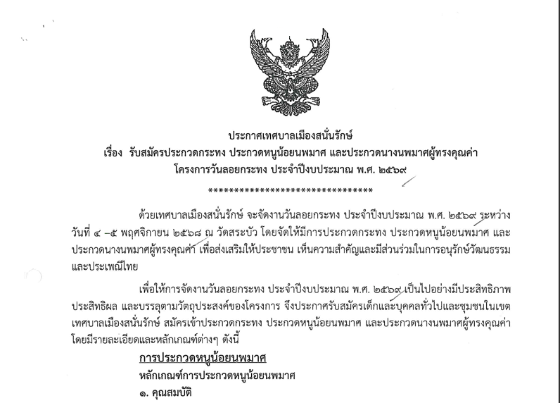 รับสมัครประกวดกระทง ประกวดหนูน้อยนพมาศ และประกวดนางนพมาศผู้ทรงคุณค่าโครงการวันลอยกระทง ประจําปีงบประมาณ พ.ศ.2569 15/10/2025
